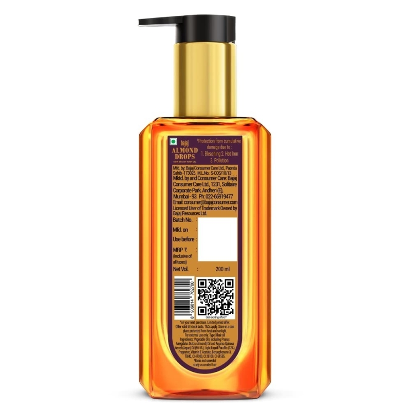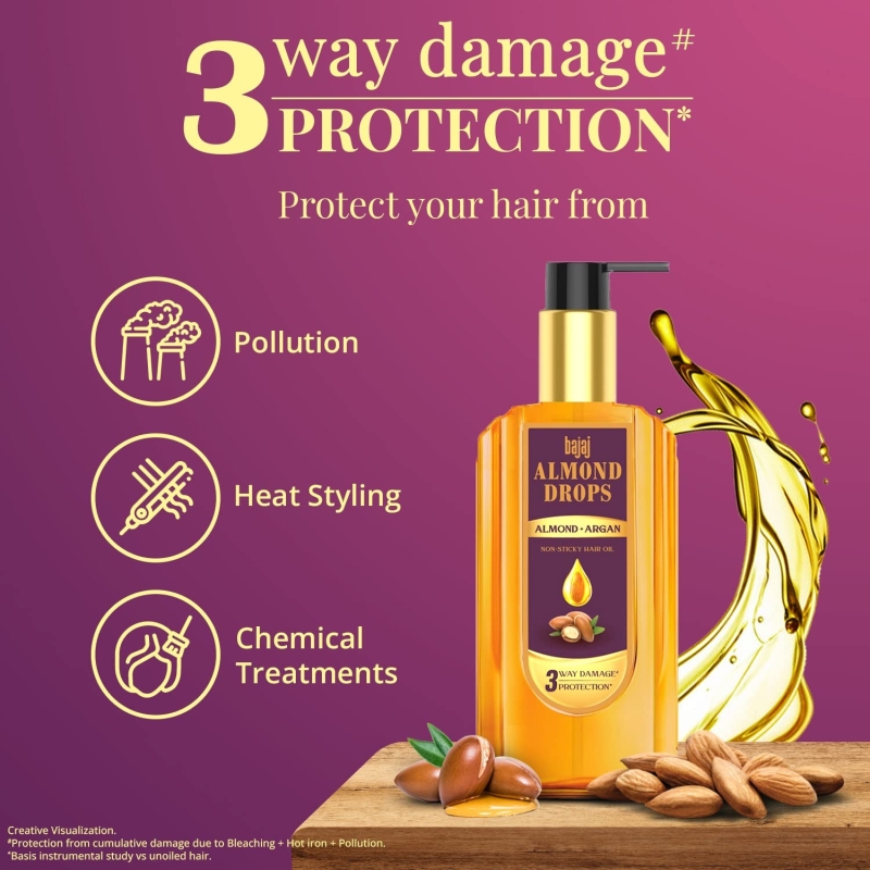 Bajaj Almond Drops Almond + Argan oil protects the hair against cumulative damage from Chemical treatments, Heat styling and Pollution