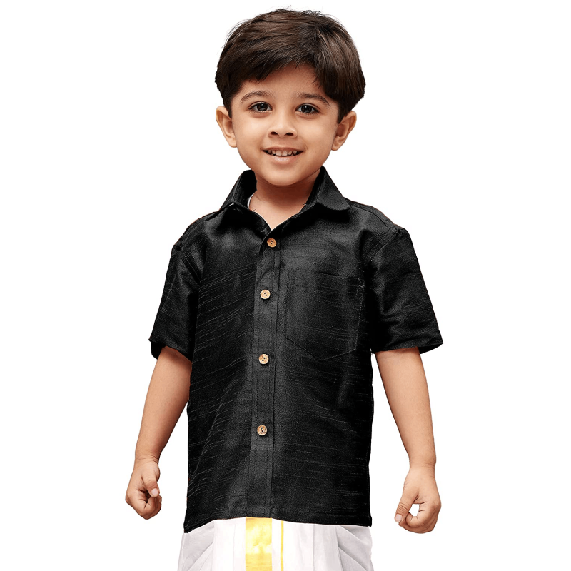 Its spread collar accentuates its sophisticated charm, while the regular fit highlights its timeless appeal. This ethnic shirt, has a button placket, half sleeves, patch pocket and curved hem. These are perfect accompaniments for a silk dhoti for traditional occasions and also on trousers for a formal, classy look. In souther part of the subcontinent these shirts are widely adorned boys boys and men as a traditional wear for any auspicious occasion.