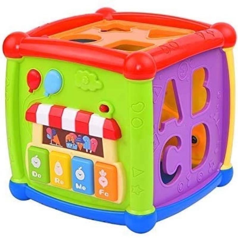 • 6 in 1 Multi-function - The baby sorting toy includes shape block,alphabet block, vehicles blcok,alphabet cognition,music learning and time learning center. Exquisite mirror and rotatable gears of cute colorful Cube is enough to attract the baby's attention,the most important is that it can be used as excellent block storage box