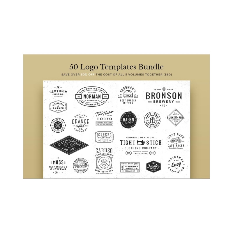Con este paquete, tiene la oportunidad de obtener los 5 paquetes de plantillas de logotipos y ahorrar más del 50% de su precio regular ($ 60). Son 50 plantillas de logotipos vectoriales que puedes utilizar para proyectos de marca, etiquetas, diseño de ropa, piezas de tipografía y mucho más. ¡Todos son totalmente editables con solo fuentes gratuitas incluidas!