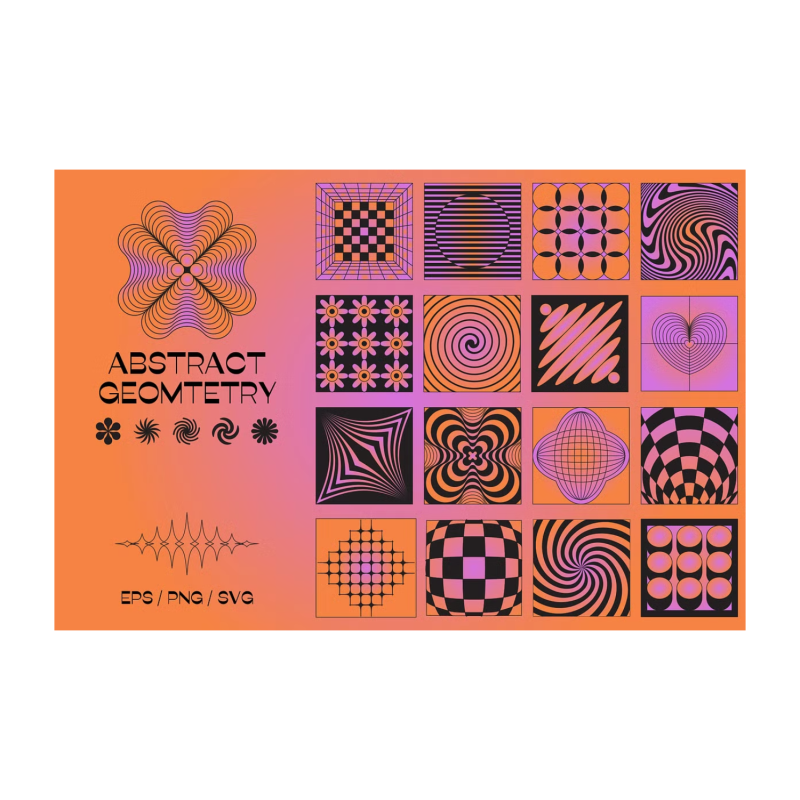 Geometría abstracta : la nueva colección con elementos gráficos vectoriales: plantillas de logotipos, marcos e impresiones. Ilustraciones decorativas y minimalistas. 150 elementos en 2 variaciones de color para sus proyectos de diseño