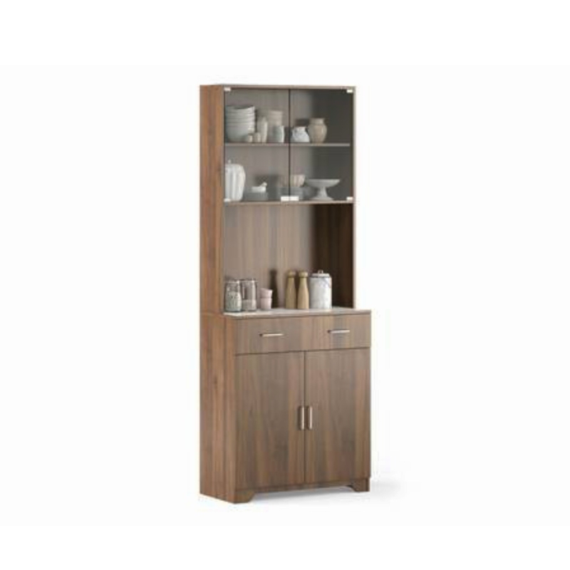 A ton of storage. The Hubert kitchen cabinet is the storage superstar your kitchen has been looking for. A mix of open and closed storage makes room for cutlery, vessels, and all else. The glass-fronted shelves provide the perfect niche for your prize china, while the melamine table top doubles up as counter space for appliances. Just what you need, whether you’re a budding cook or a practised chef!