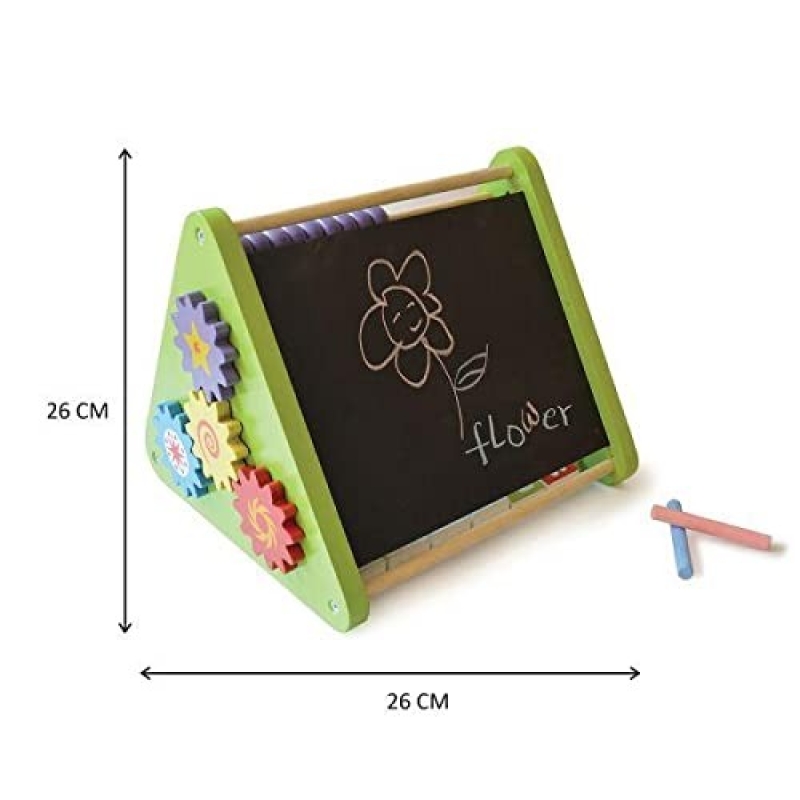 • 5-IN-1 MULTI ACTIVITY TOY: Long lasting premium quality wooden 5-sided multi-activity toy, with abacus, alphabet swivel blocks with pictures, chalkboard, clock and wooden gears, makes it fun for your child to understand important preschool learning concepts.