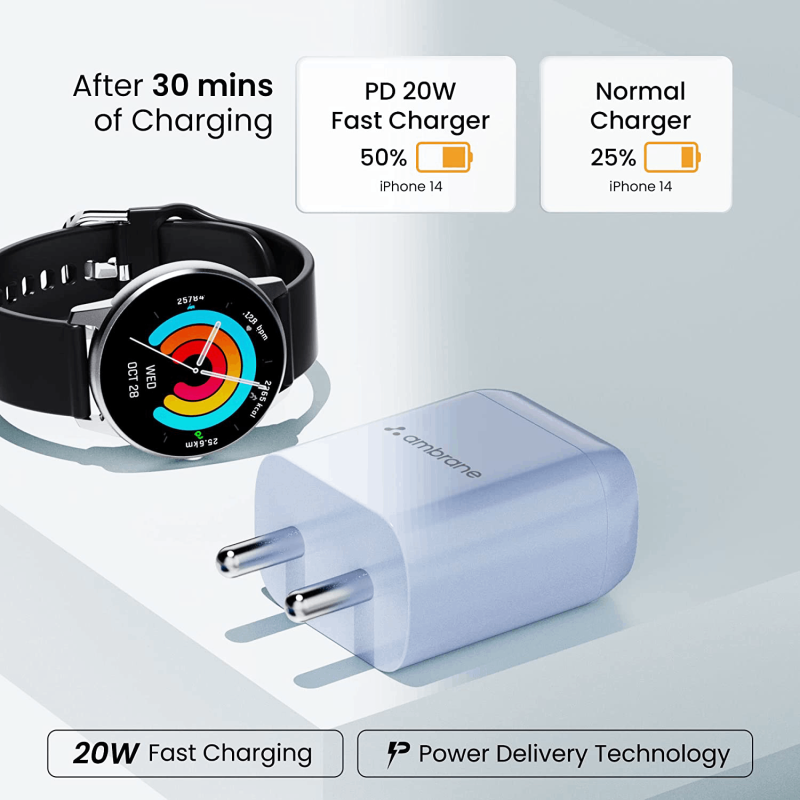 20W Boosted Speed - Charge up your devices and experience Ambrane’s BoostedSpeed technology with RAAP M20; PD Fast Charging - This charger gives an ultra-fast charging experience with its special Power Delivery (PD) Technology.