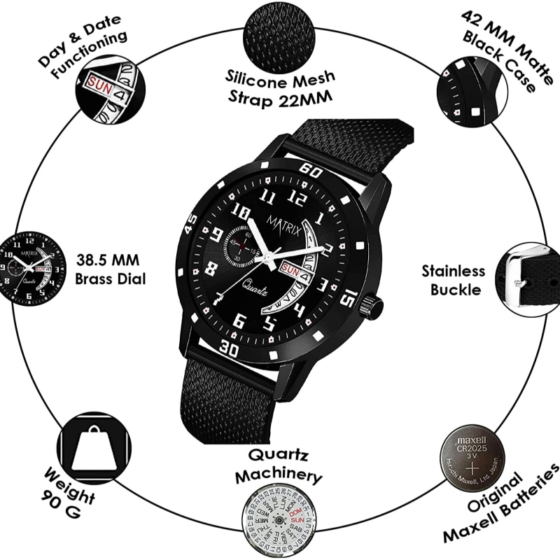 Dial : Black , Features : Day & Date Functioning, Mesh Design Silicone Strap