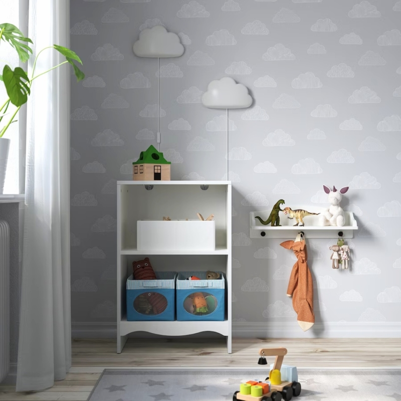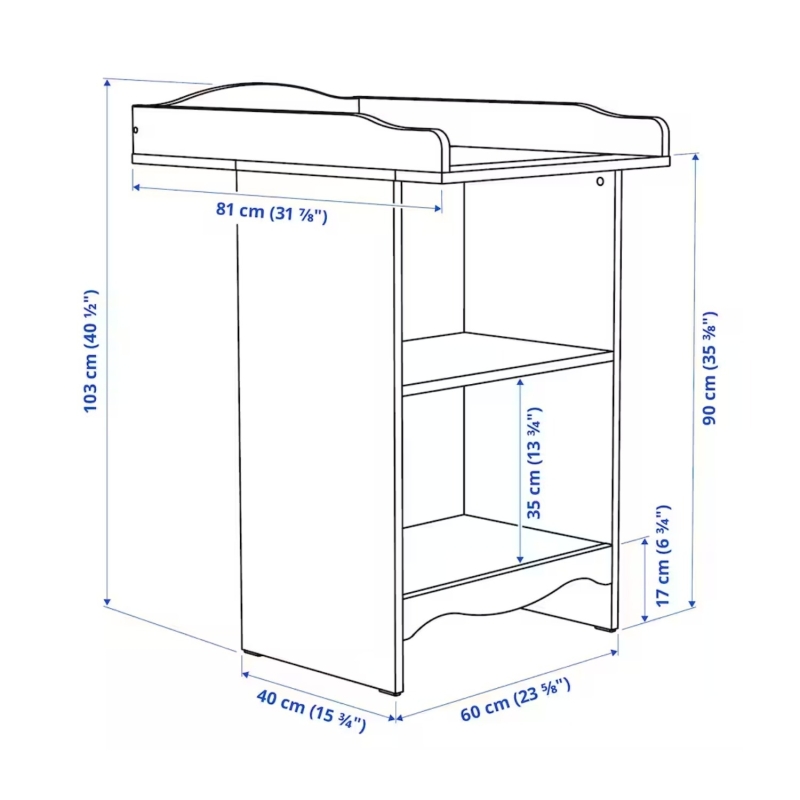 • Between the changing table’s shelf and the wall there is a space where you can put a laundry basket or something else you want hidden. The space has a depth of 29 cm and is 80 cm high.
