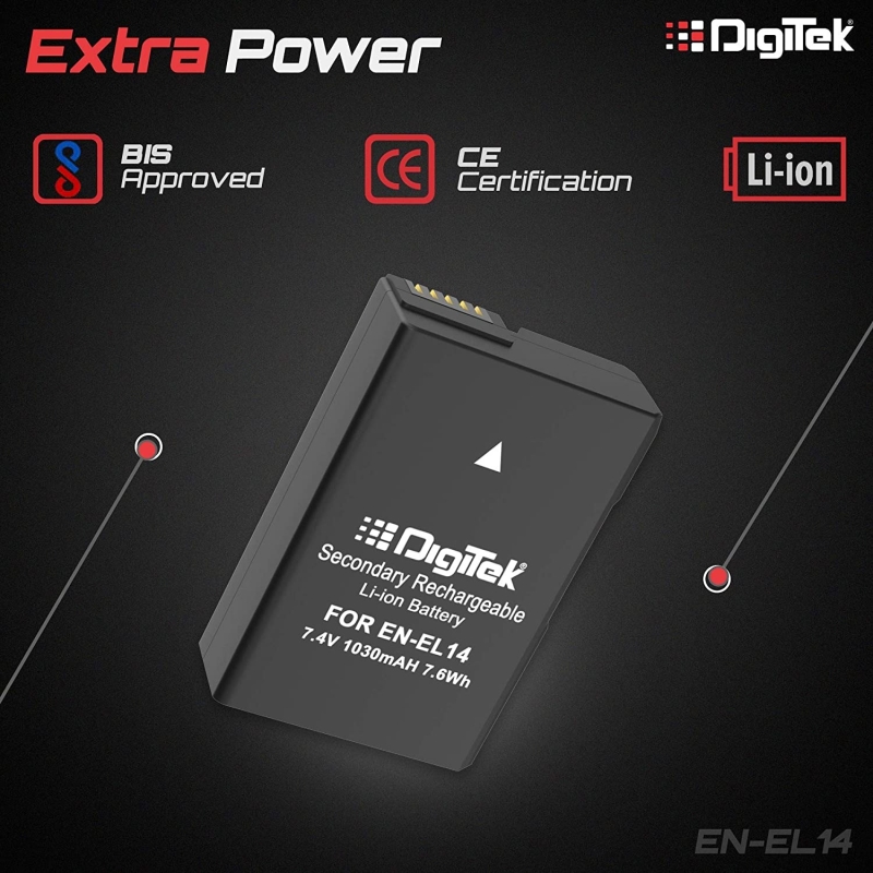 • Special Features: Digitek Li-ion Battery EN-EL-14 is rechargeable & fits for Nikon Model DSLR Camera. It is of 1030mAh & 7.4V capacity.