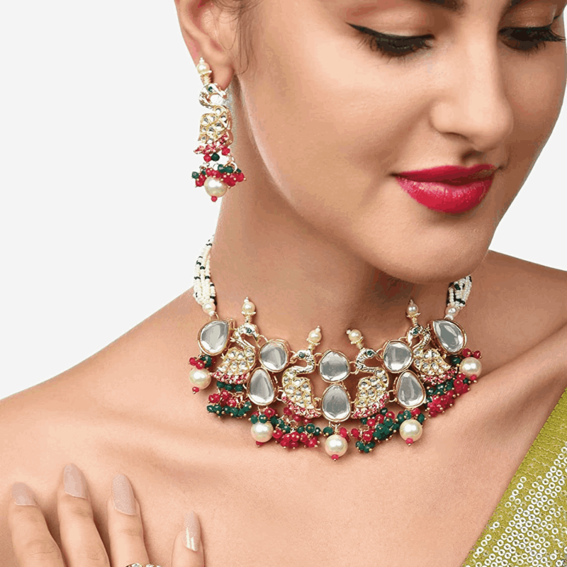 Rani Pink & Green Cluster Beads Kundan Peacock Inspirado Collar