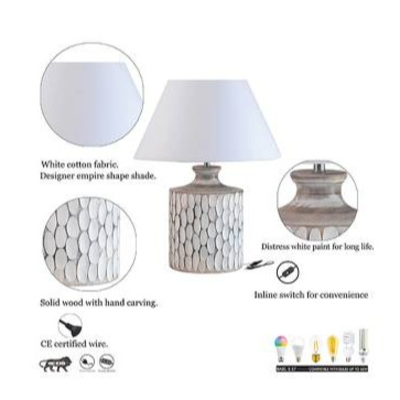 • A traditional design gets a dash of weathered character with this product. Crafted from chunky wood bases, its base showcases a turned silhouette and a distressed, wood finish for an airy and antiqued look. Up above, a w cotton drum shade rounds out the design
