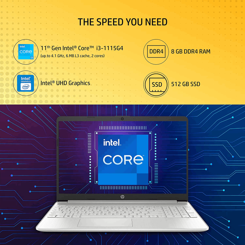 • Do Check Partner offer section for Exciting offers from HP; Processor: Intel Core i3-1115G4 (up to 4.1 GHz with Intel Turbo Boost Technology(2g),6 MB L3 cache, 2 cores)|Memory: 8 GB DDR4-3200 SDRAM (1 x 8 GB)| Storage: 512 GB PCIe NVMe M.2 SSD